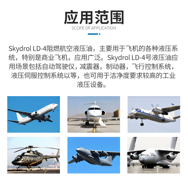 除了Skydrol LD-4之外,河南航材還能為您提供符合AS 1241 V類標準的Skydro 5、Skydrol PE-5型阻燃液壓油,歡迎致電選購!